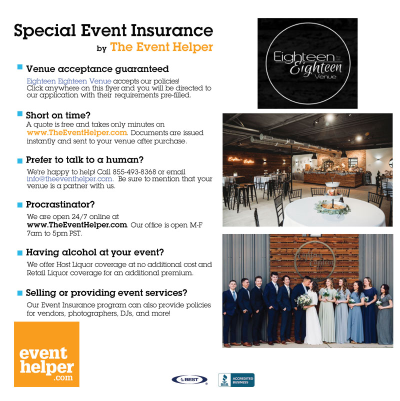 If it's a small event such as a baby shower or funeral meal then this is NOT required. However, if its a large event, especially with alcohol being served, then OUR INSURANCE Co. requires the renter get their own policy. You can use whatever insurance company you like. Check with your Homeowners Insurance first. You may be able to get a one day “Event Liability Policy” listing Eighteen-Eighteen Venue, LLC as an additional insured.